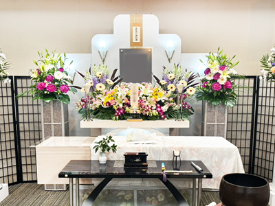 パープルカラーが落ちついた空間を演出してくれる祭壇です。