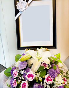 写真前アレンジは祭壇と同じパープルを基調に、カサブランカで上品な仕上がりです。