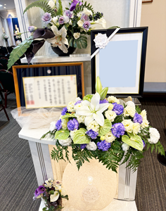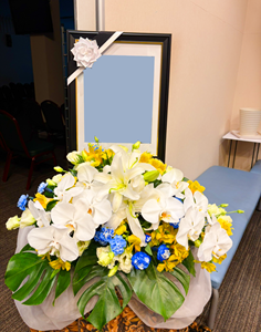 遺影横の装花もブルーとイエローで合わせ、爽やかさを演出しました。