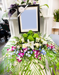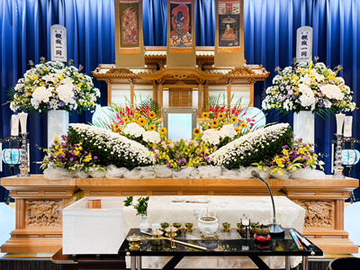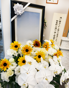 華やかなカラーで遺影を彩り、明るい雰囲気を演出しました。