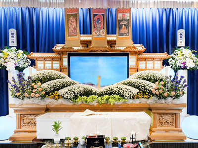 両手で遺影を包んでいるかのようなデザインが印象的な祭壇です。